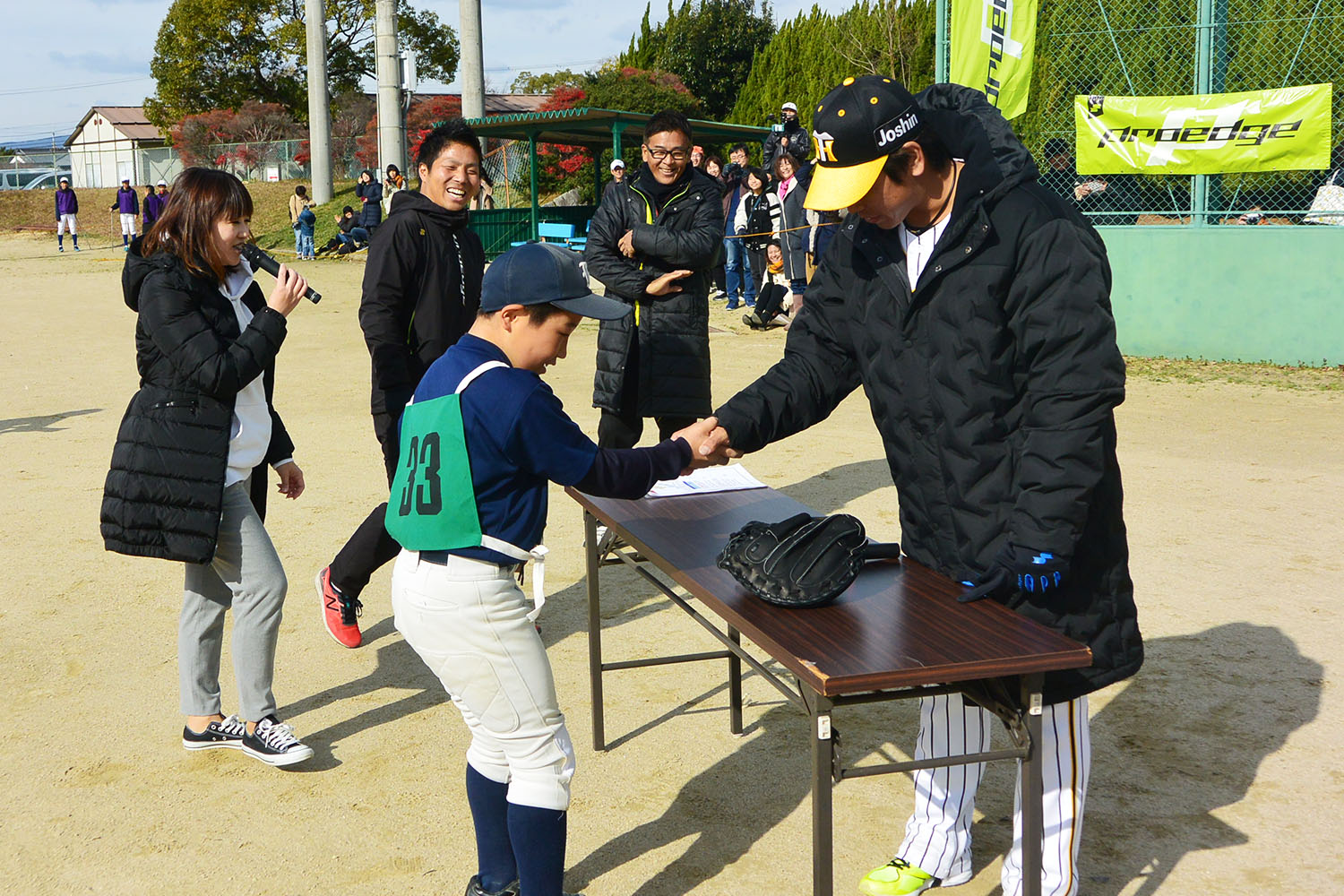 練習後には、バッティングのデモンストレーションやサイン入りグッズをプレゼントする抽選会やじゃんけん大会を実施。今回も野球教室をしたいと自ら言ってくれた梅野選手の人柄が溢れた、笑顔に包まれた一日となりました。