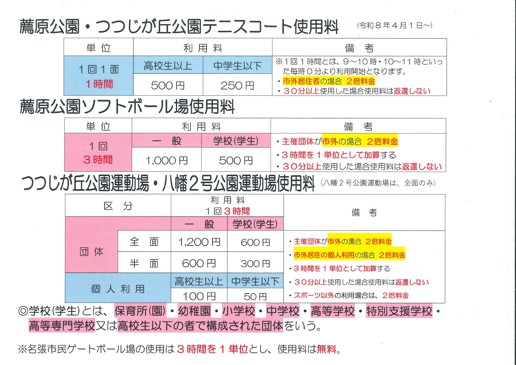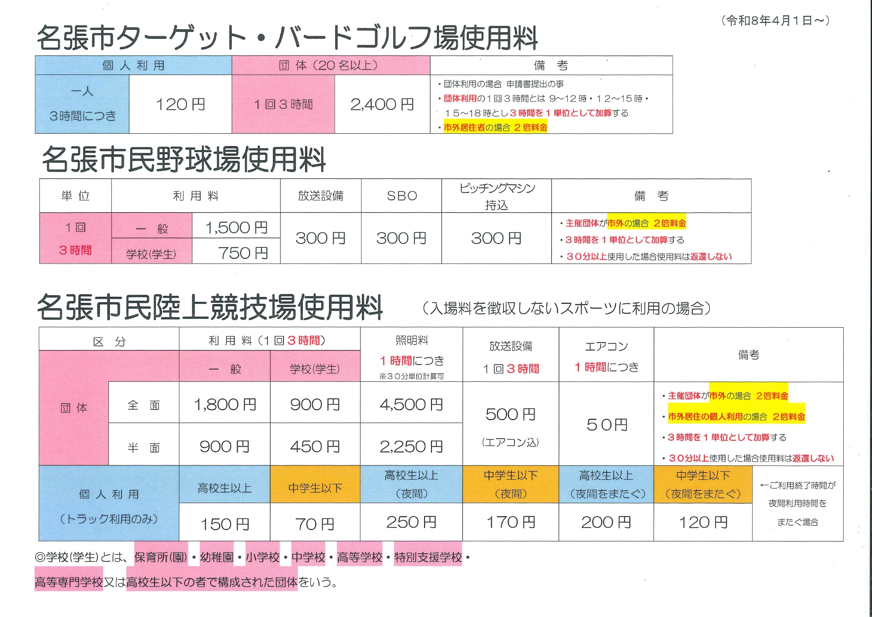 お知らせ 2025.11.22 いつも名張市体育施設をご利用いただきありがとうございます。 このたび、令和8年度より各施設の使用料が改定いたします。 改定した各施設の料金一覧表になります。 よろしくお願い申し上げます。